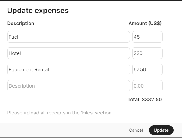 Any expenses a creator wishes to add must be fully accounted for as opposed to "partial payments". Creators should keep all receipts and upload them to the Details tab within the project page, making sure these expenses are itemized and clearly described when entering them. All expenses that are approved when the client marks the project completed will be paid along with the price of the project itself.