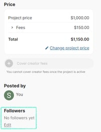 You will automatically receive notifications each time an action is taken by a creator on one of your postings or projects whether it is a new proposal, a new message, or the acceptance of an offer. Adding followers allows your colleagues to receive these notifications as well, so you can easily collaborate and stay in the loop on your company's postings and projects.