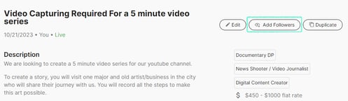 When viewing your posting or project, click Add Followers, then select the names of the colleagues you wish to add as followers on that posting. Once selected, they'll immediately begin receiving notifications for the posting.