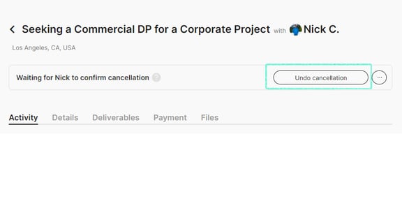 You will see the cancellation reflected in the project page immediately. If, for some reason, you need to undo the cancellation, you can also do so by selecting Undo Cancellation on the Project page.