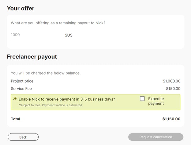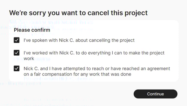 Here is where you must confirm that you have discussed a cancellation with the creator, you have attempted to resolve the issue before committing to a cancellation, and you have agreed to a fair rate of compensation for the work that has already been completed. Upon marking the checklist, hit Continue.