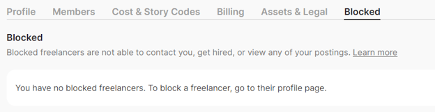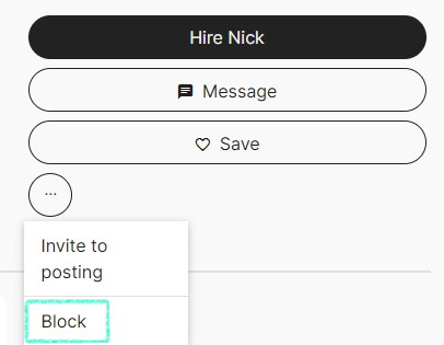 If you do not wish for a specific creator to be able to contact you and wish to prevent them from viewing or applying to your Posting/Projects, you may block them. First, navigate to the creator’s profile page and click the ellipsis symbol on the right hand side to find the Block Freelancer option.