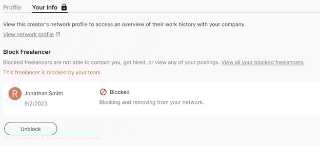 We understand things don't always go according to plan, and if you have an unfavorable experience working with a freelancer you should always contact your Account Manager or reach out to support@Kaynuna.me. Once blocked, that specific creator will no longer be able to contact you, be hired by you, or view any of your postings.