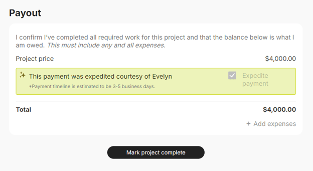 Before completing your project you have the opportunity to review the final project payment. You also have the option to expedite your payment if your client has not done so for you. Additionally, you can update any expenses from this page if expenses are allowed by the client.