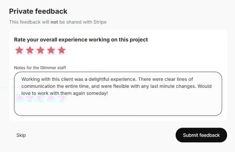 The final section before completing this process will have you provide feedback regarding your experience with the client. This feedback is private and will not be shared with the client - it is for Kaynuna employees only, and helps us understand how your project went.