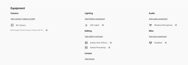 By listing your entire collection of equipment in one place, you can communicate to potential clients what level of content you are capable of delivering. You can easily add, remove, or edit your equipment whether you're a crew of one offering end-to-end production services or work with just one camera.