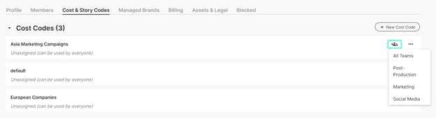Kaynuna now offers Admins the ability to allocate Cost & Story Codes to specific Teams. These codes can be assigned to one Team, many Teams, or no Teams. This makes it easier for companies to track spend by Team and can help companies stay organized by grouping Teams with different content categorizations. To add a Cost or Story Code to a specific Team, select the Teams Icon on the right side of the page in the Cost & Story Codes section.