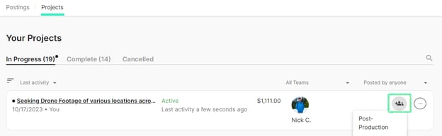 Admins can assign a team after the posting or project has been created. To do this, locate the posting or project and click the Teams icon on the right side of the page and designate a team from the drop down.