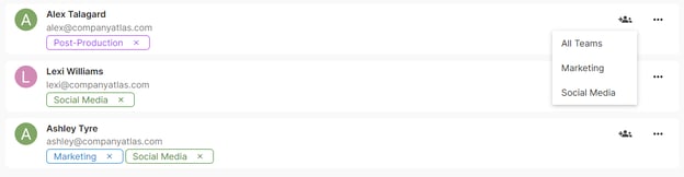 On the Members page, scroll down to locate the user you wish to add to a team. On the right side of the page, click the Teams icon and select the team that you’d like to assign that user to. Keep in mind that a user can be assigned to more than one team.