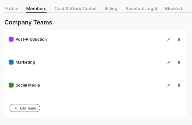 Select the Members tab, where you can review all account users and their designated teams. Your complete list of company teams should be visible at the top of your Members page.