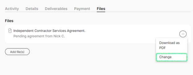 Here you will find your Files, which allows you to upload and edit your legal documents attached to the project. The contract listed there will be the current contractor agreement. To change it, click the ellipsis button to the right and select Change.
