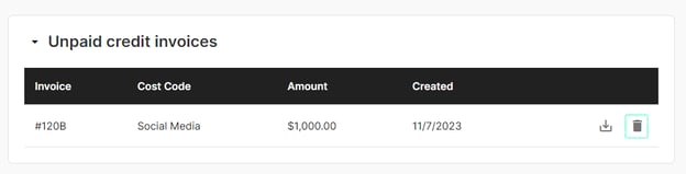 In some instances you may need to delete an unpaid credit invoice. You can do so by selecting the delete icon on the unpaid invoice you wish to remove.