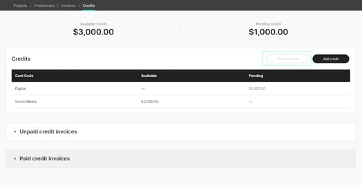 There may be instances where you have credit on one cost code that you wish to move to another. If this is the case, you can do so by selecting the Transfer Credit button on the Credits page.