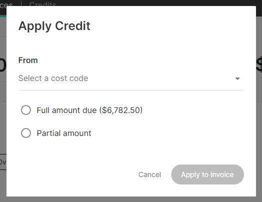 From here you will receive a pop-up prompting you to select the cost code you’d wish to draw funds from. You also have two different options regarding payment: You can pay the full amount with credit, or you can pay a partial amount with credit. If you choose to pay a partial amount, the new total will be expressed on the invoice, as well as the partial amount you paid.