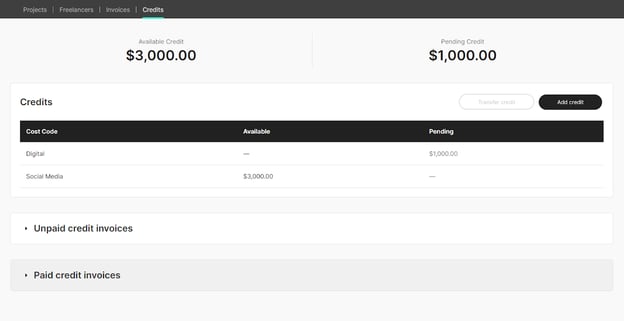 Credit is a way of prepaying for projects on your Kaynuna account. Purchasing Credit can be seen as loading money onto your account that is ready for you to use at any time, and can be directly applied to projects. We allow you to do this through the use of Cost Codes, which act as the carriers for your credit on our platform. When you pay creators on credit, we can submit payment to them within two weeks.