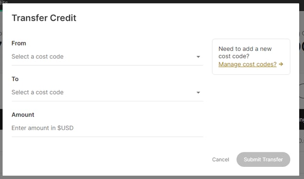 Here you will be given the option to select the cost code that will be receiving your credit (where the credits will be going to) as well as the cost code you will be transferring that credit from. If you wish to create a new cost code to receive your transferred credits, you can do so here. Once you have your destination cost code and origin cost code decided, go ahead and type in the amount you wish to transfer and select Submit Transfer.