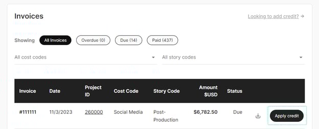 The Invoices section of the Reports page shows you a breakdown of your spend on the platform, providing associated project ID numbers, cost codes, story codes, and the amount the particular project cost. You can read more about these Invoices here.