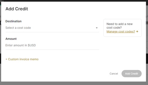 When purchasing credits, keep in mind that these credits must be applied to a specific cost code. This gives you a way to categorize spend across your various projects, simplifying your payment processes. The easiest way to load credit onto a cost code is to have already made one (which you can read more about here), but in case you need to create one on the fly you can always do so when adding credit to your account.
