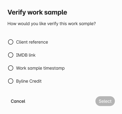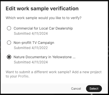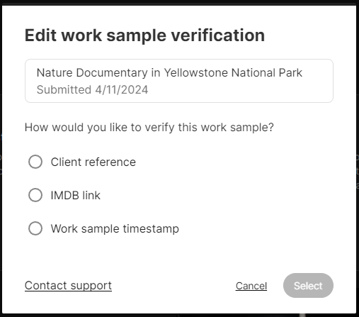 Select how you wish this work sample to be verified. If you select Client Reference we will send an email to your reference confirming the work you had completed - however, we encourage you to let them know to be on the lookout for a verification email from us. Once you've confirmed your choice, click Select to update your work sample verification method.