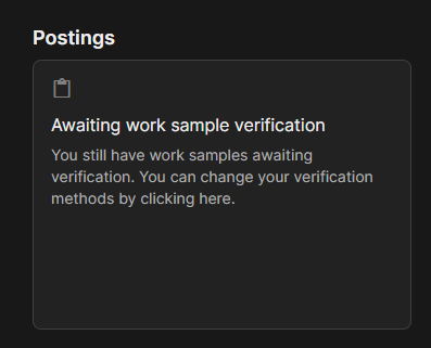 We make it easy to update your verification methods so that your work can be verified in a timely manner. From your Creator Dashboard, click on the Postings card (pictured above). This will open up a list of all work samples still awaiting verification.