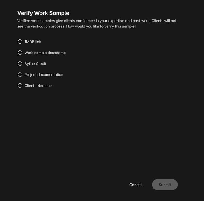 Select the desired method of verification. To read more about the many ways to verify your work samples, check out our other support article about the verification process.